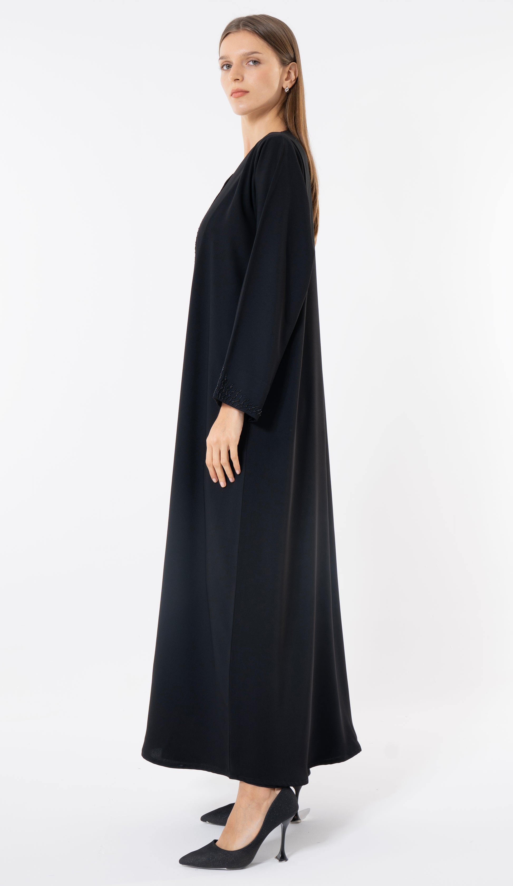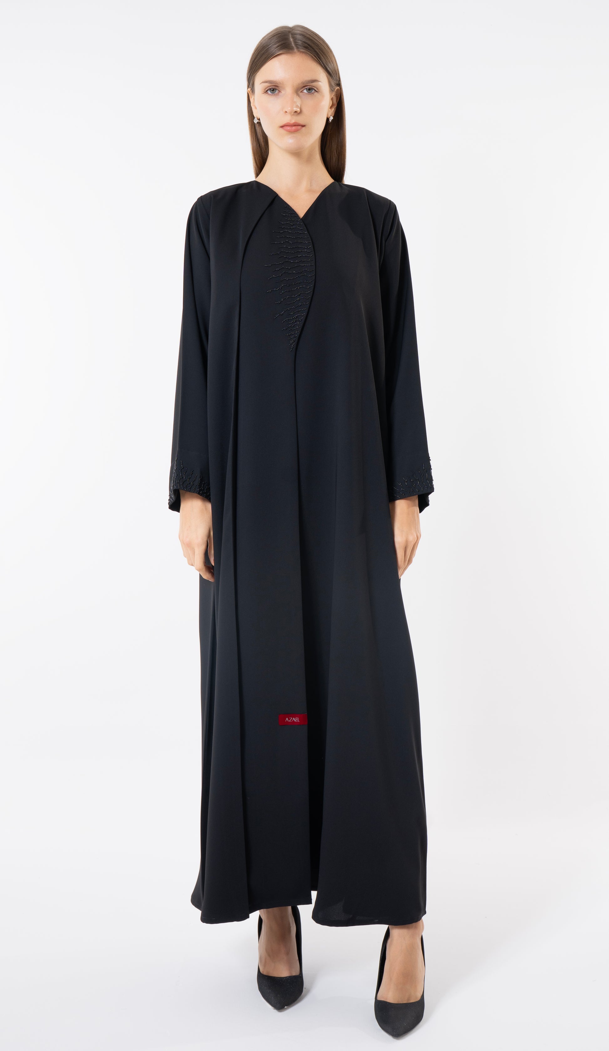 Black Modern Layered Front Abaya With Embellishments On Front And Sleeves