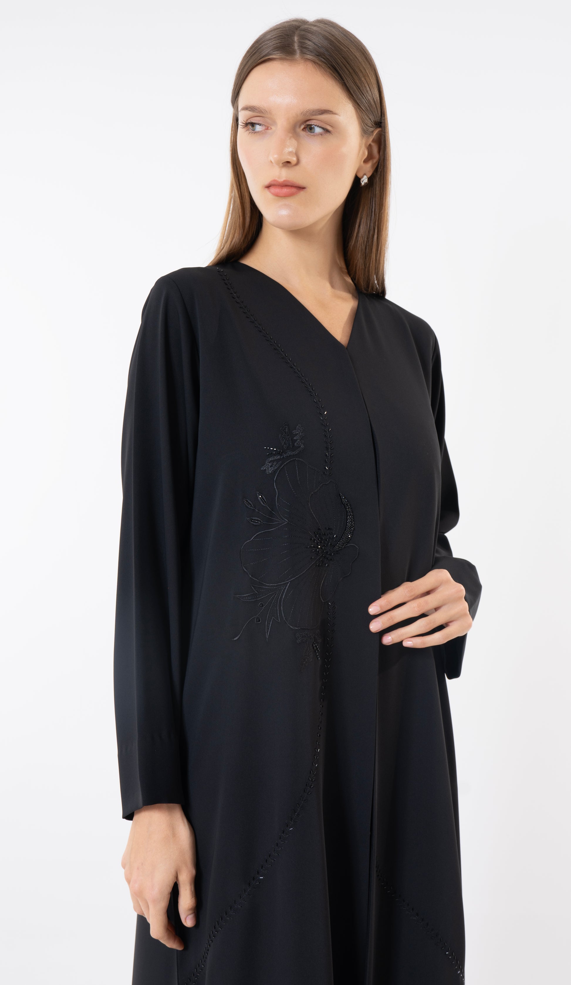 Floral Embroidery With Thread And Beads Embellishments In Black Abaya