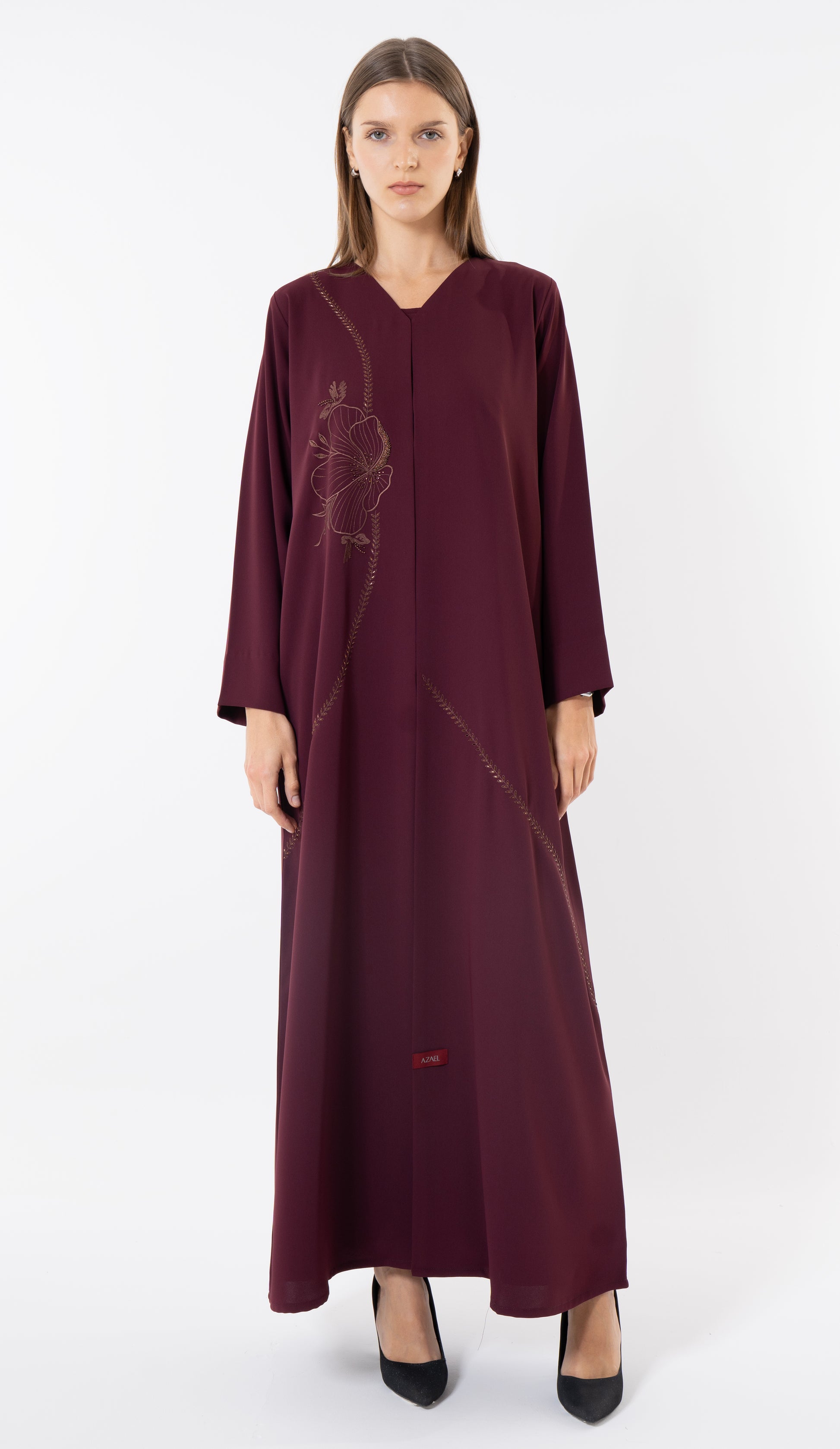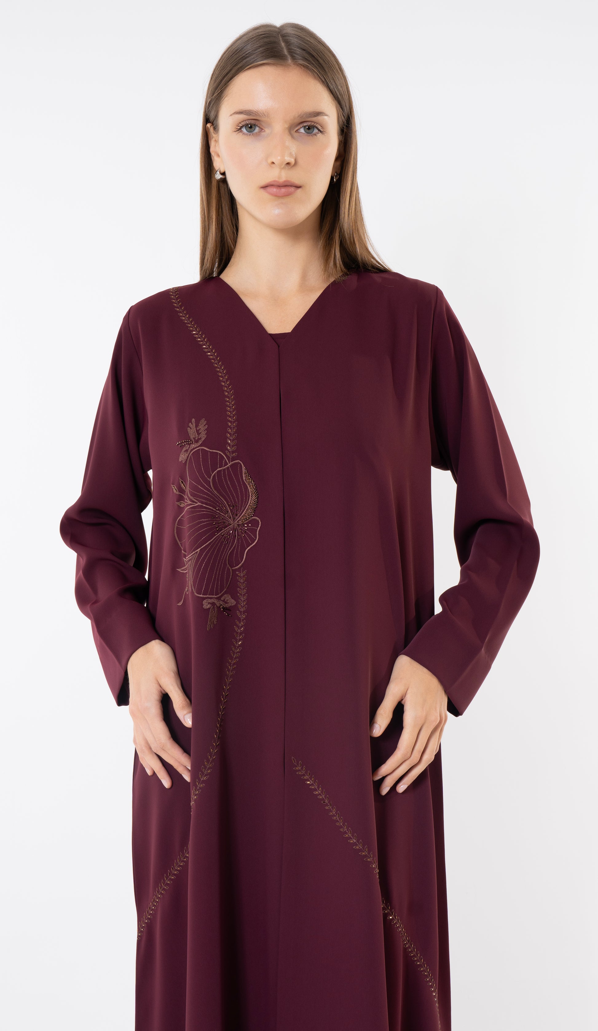 Floral Embroidery With Thread And Beads Embellishments In Maroon Abaya